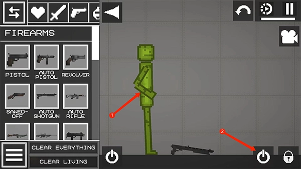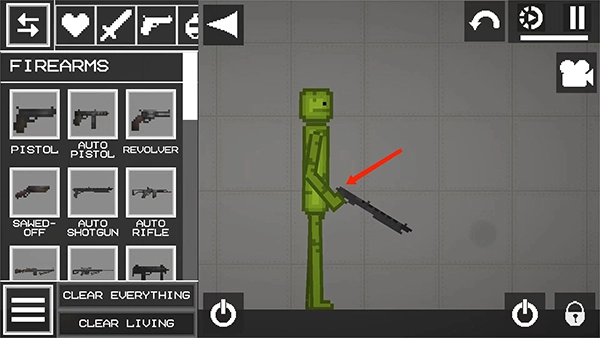 5、如图所示,能看到西瓜人物手中已持有枪械,点击按钮即可进行射击,以上便是让人物持枪的教程。