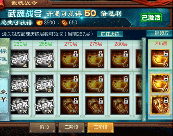 培养神兵的主要方式。所有加成对全体武将生效,精英挑战每日需买满次数。无需额外购买挑战次数,每天2-3次完全足够。建议在战力有显著提升后再进行挑战。对应的“武魂战令”,非常推荐购买豪华版。