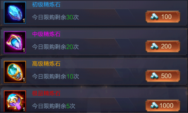 用于装备精炼的精炼石以及高级装备的主要来源途径。装备和精炼都是全体武将加成,加成幅度非常大。每天必打新的关卡“精铁”优先购买精炼石。