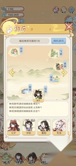 4、最重要的游历,不需要太长时间就能让神灵数量与游历地点数量持平,所以直接随机游历即可。