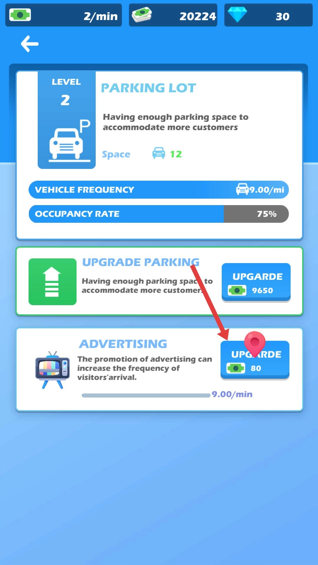 3、进入停车场界面,点击广告栏UPGRADE,消耗80货币升级广告,增加访客频率,助力发展。