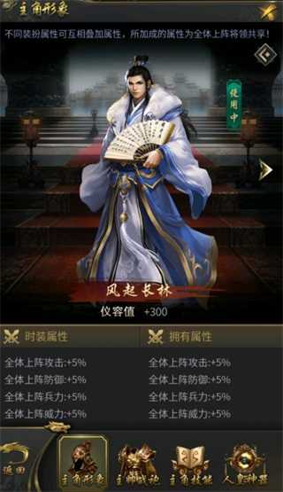 在《逍遥三国》里,各位将领个个武艺出众、骁勇善战,咱们的主角同样本领高强、身怀绝技。主角不仅拥有俊朗的外形、身披威风的主帅战袍,更有专属的主角技能与人皇神器,助力主公征战沙场!1、主公您可以在主界面点击“主公”雕像进入主角界面,在这里能更换主角形象。这些形象可通过晋级爵位、购买VIP礼包、榜单奖励等多种途径获取,稀有形象还能为主公带来各类属性加成呢。