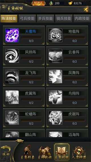 4、提升技能等级时,需消耗对应的阵法碎片与才华值,而且等级越高,所需的材料数量就越多。拿天覆阵来讲,从0级升到1级要花费2个天覆阵碎片和200点才华值,从1级升到2级则需要3个天覆阵碎片与400点才华值。