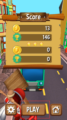 3、跑酷结束后,查看得分界面,点击PLAY按钮可重新开始,不断练习熟悉障碍节奏,优化操作,获取更高金币数与分数。