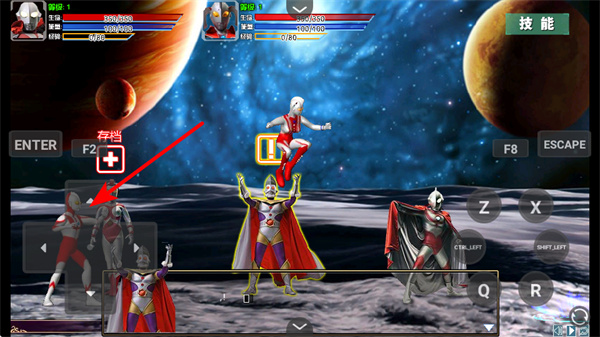 1、在奥特曼战斗游戏中,操控左侧奥特曼角色,通过虚拟按键调整移动方向,在星际战场中灵活走位,创造位置。