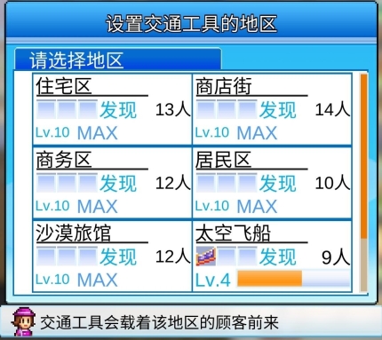 贵宾需要商战中获胜,获胜后会获取一些交通设施,设置交通工具后点击交通工具会看到这么一个页面,进行设置交通工具去往的地区,当一个地区顾客等级升满以后,在店铺里如果有贵宾喜欢的店铺就会来店,要进行招待。