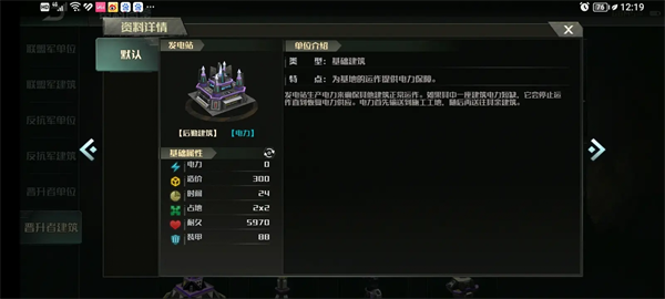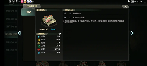 所有建筑均为III级甲(即游戏内的重型装甲);为便于理解,游戏里的补给点统一以(钱/资源)标识,电力单位用(度)表示,耐久度则以(生命/血)来指代。