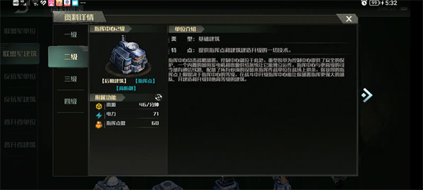2级:提供:资源46/分钟,71度电,60点指挥点数。