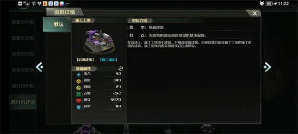 解锁建筑:施工工地、突击车工厂、特种车工厂、船坞的上限均为3;空军工厂上限3;机场上限2;基础防御塔上限4;炮塔上限3;防空塔上限6;海上防御塔上限4