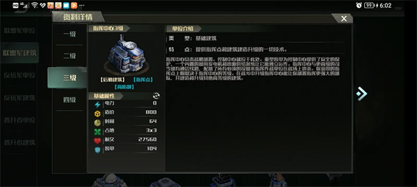 反抗军的都指挥中心在1到3本阶段,相比另外两个阵营的同类建筑生命值更高,这与该阵营其他建筑生命值普遍偏低的情况形成反差。具体数值为:1本时生命值19100、护甲94;2本时生命值24600、护甲99;3本时生命值29860、护甲104。