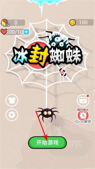 1、开始游戏的页面打开,点击开始游戏的相关按钮,进入冰封蜘蛛的解谜关卡。