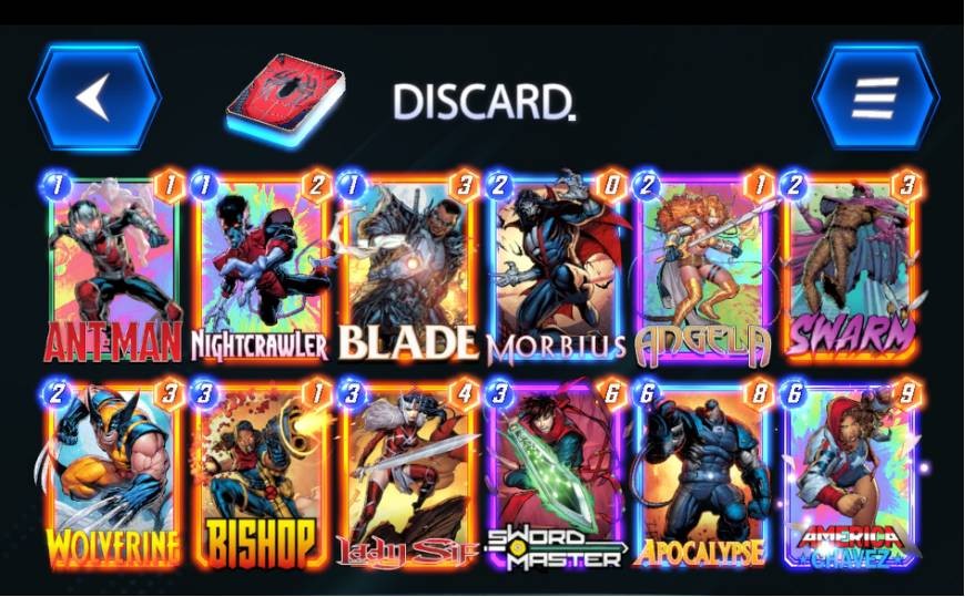 优势:对局前期依靠低费用卡牌平稳过渡,后续借助She-Hulk这类高费卡牌构建起强力的战力压制体系。该组合要求玩家把握恰当的时机打出高费卡牌,一旦操作成功便能对对手形成极大的威胁。