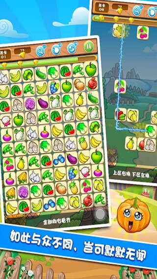 这是一款操作简便的休闲消除类游戏,主题围绕着各类美味的蔬菜水果展开,像桃子、香蕉、橙子、菠萝、草莓之类的都有涉及。游戏的画面与背景十分清晰明亮,关卡的设计也新颖又有趣。