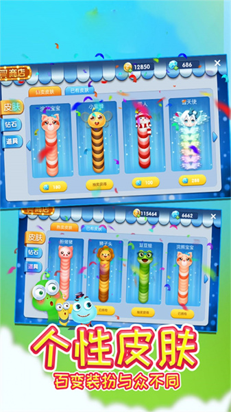 个性化的皮肤和装扮,自由搭配,控制小蛇尽情游戏,简单易上手,与其他玩家的蛇蛇争霸;