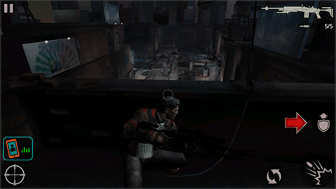 1、首先进入到游戏中,游戏开始我们将身处天台上,点击右侧的盾牌箭头图标,主角将站起离开掩护。
