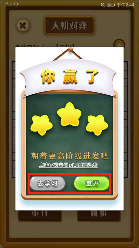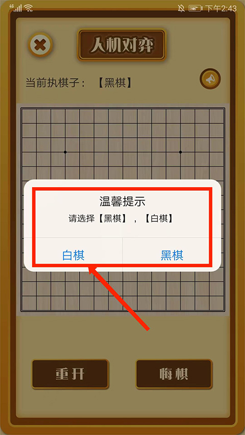 进入【人机对弈】界面,挑选白棋或黑棋,此处以【白棋】为例。