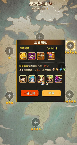 每个派遣任务同时还拥有额外奖励当派遣所需英雄属性达到要求时,即可增加额外获得奖励的几率额外宝箱可以获得大量稀有材料和珍惜道具哦~同时要是运气不佳,可点击右下角的刷新,把高级别的派遣刷新出来哦~