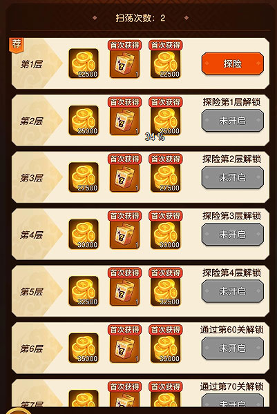 每个副本每天可扫荡两次,首次通关的情况下,还可获得橙色碎片盲盒并且基础奖励双倍哦~其中精铁和升星材料盲盒为士兵升星最为重要的材料快来带上你的军团,和我一起前往秘境探险吧!