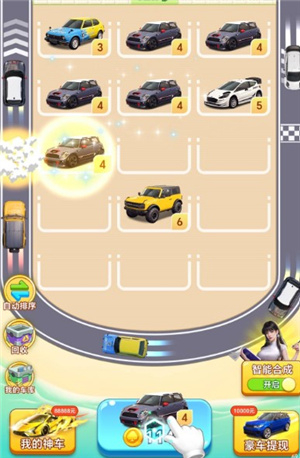 这是一款钱途满满的休闲小游戏,核心玩法就是合成汽车领红包,而且能一直领哦。操作起来特别简单,玩家只需要不断购买车辆,然后把相同等级的车拖到一起就能合成升级。当合成出5级汽车后,自动合成功能就会解锁,之后就不用玩家手动操作了,车辆会自动快速完成合成,大大节省了时间。