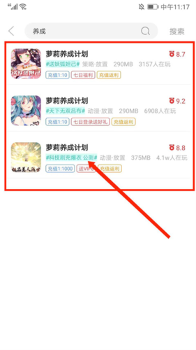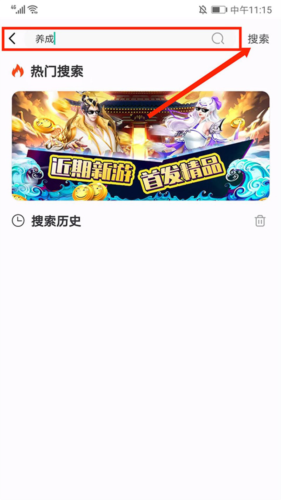 3接下来进入搜索页面,在顶部的输入框中填写你感兴趣的游戏名称,再点击搜索按钮就能查找相关内容了,此处我们用“养成类”游戏来演示操作流程。
