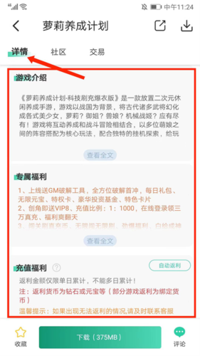 6在详情页面中,能查看游戏介绍、专属福利、充值福利等板块,便于更全面地知晓游戏内容与折扣优惠。