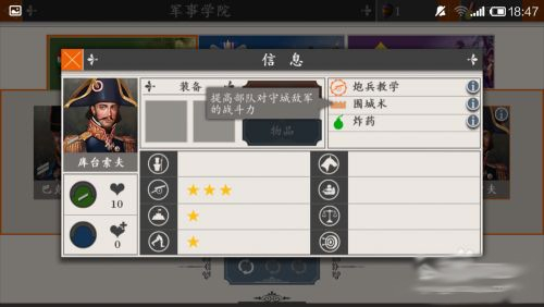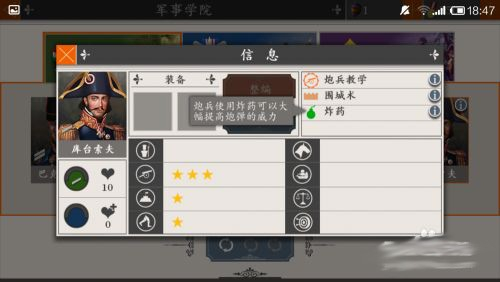 3、库台索夫的第一个技能是炮兵教学,当被整编时候,可以增加炮兵的一个星级,还不错。