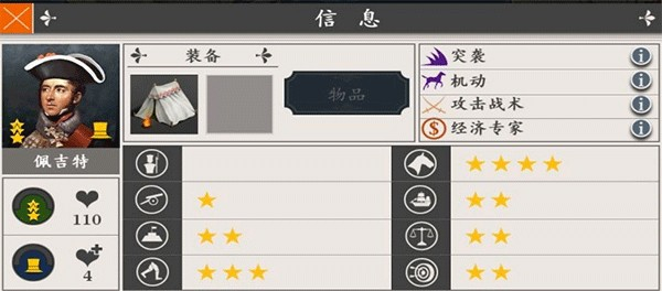 佩吉特身为英国的军人与政治家,1784年到1812年期间被称作佩吉特勋爵。他在骑兵指挥方面的能力评级为4星,掌握着“突袭”“机动”“攻击战术”“经济专家”这四项技能。其中“机动”技能能够增强骑兵的机动能力,让部队行进得更远。