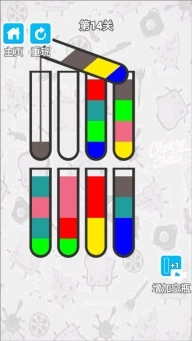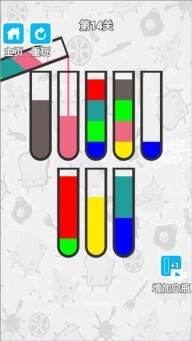 10、接着按顺序把第一排剩下的两个装有混合液体的瓶子,依据颜色分别倒入不同瓶子里,就能顺利通关了。