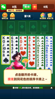 这是经典益智游戏蜘蛛纸牌的简化版本,玩法更简单轻松,还采用了闯关模式。每一关都有不同的排序和变化,让你的每一次挑战都充满惊喜,游玩过程也更有趣!而且,每次成功闯关还能获得丰厚的奖励哦!