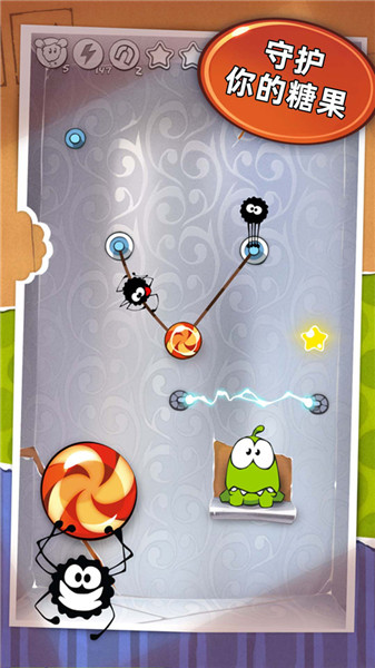 在游戏的前六关里,首先要扎破那个内含糖果的气泡来获取一颗星星,接着切断右上方的绳索,让中间绳索上的糖果被撞进气泡里。等收集完剩下的两颗星星后,再把中间的绳索割断,拿到小白花的瞬间立刻戳破气泡,最后切断右下方的绳索,就能以三星成绩完成关卡了。