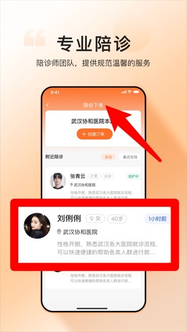 在“陪诊下单”页面选定医院后,你可以查看陪诊师的相关资料,进而快速生成服务订单。