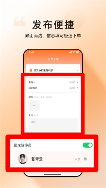 3、填写陪诊人信息、服务时间等相关内容,可添加备注说明,也能选择指定的陪诊员,整体操作流程简单清晰、易于上手。