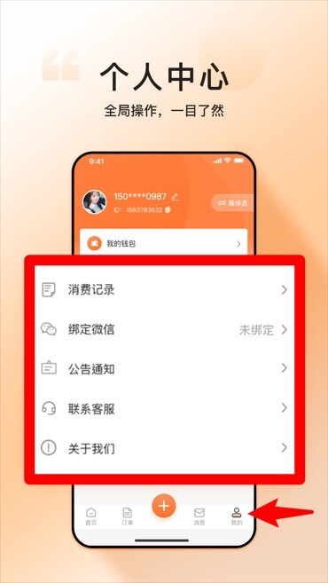 4、点击底部的“我的”选项进入个人中心,在这里可以查看消费记录、公告通知,还能使用联系客服等功能。