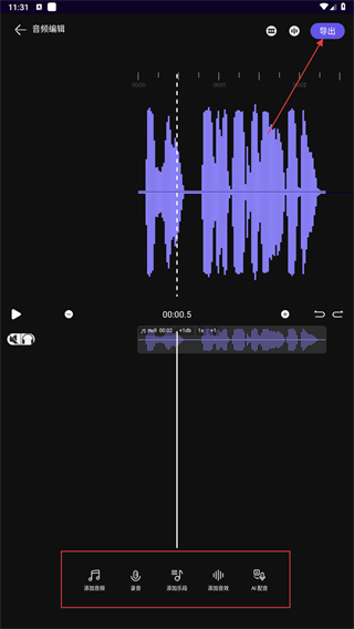 3、进入音频编辑页面后,可借助【添加音频】【添加音效】等功能对音频进行编辑操作,编辑完成后点击【导出】按钮,即可进入预览环节。