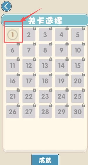 2、看关卡选择页,点蓝色圆形左箭头返回,或选数字1浅黄色方格开启首关,其他带锁关卡暂未解锁。
