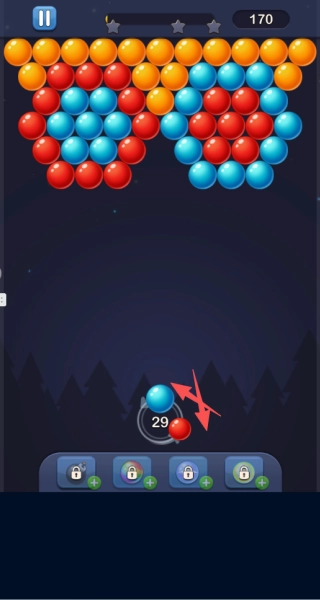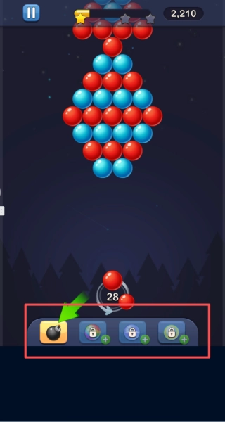 2、点击底部颜色切换按钮可循环选择不同色彩的气泡,灵活调整攻击策略。