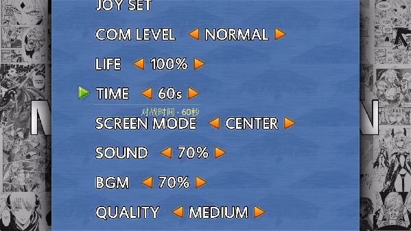 2、其中我们可对游戏内的对战时间、血量、操作方式等各项内容进行自定义的设置
