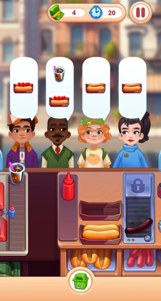 3、将烤糊的香肠丢在垃圾桶里,快速的重新烤香肠,满足每一位顾客的要求,就能赚取很多金币。