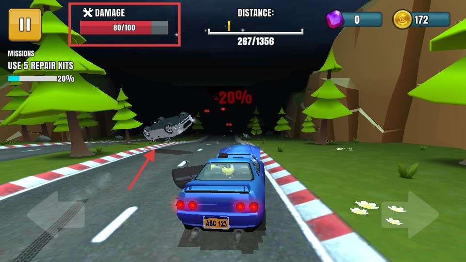 2、驾驶过程中躲避如翻转车辆的障碍物,防止【DAMAGE】值下降,尽量延长行驶距离。
