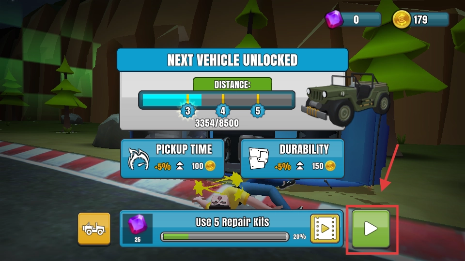4、完成任务后点击绿色播放按钮继续游戏,积累距离以解锁新车辆并升级属性。