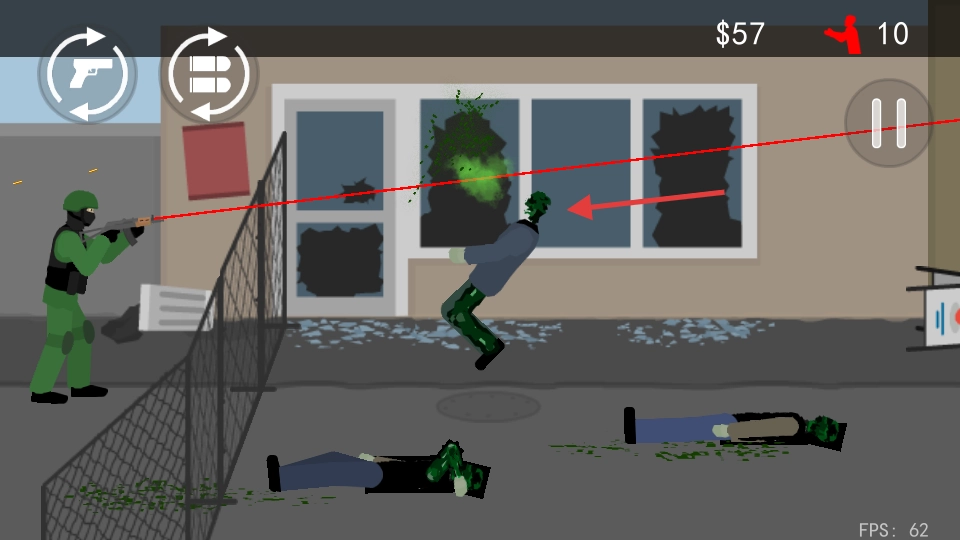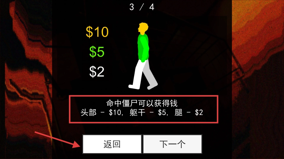 1、击中僵尸头部可获得【$】【10】,躯干【$】【5】,腿部【$】【2】,建议优先瞄准头部来积累金钱购买武器。
