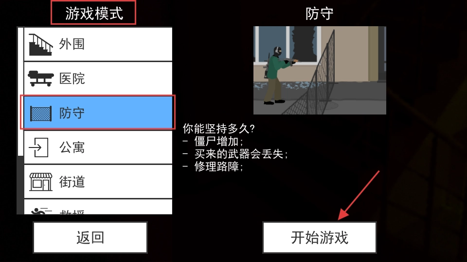 2、选择【防守】模式,了解僵尸增加、武器丢失、修理路障规则,点击【开始游戏】进入挑战。