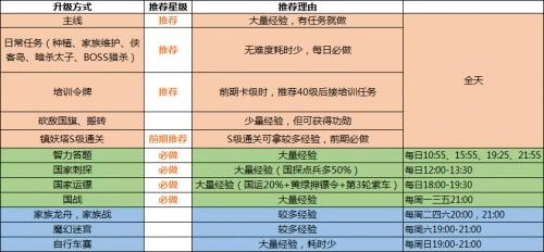 日常活动日常活动是获得大量经验的主要渠道之一,尤其是左上角有高收益标识的日常活动。随着等级的提升,可参与的日常活动也会增加。在国运期间(每天18:00-19:30)进行皇城运镖、国探期间(每天12:00-13:30)进行刺探可获得120%经验奖励。