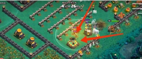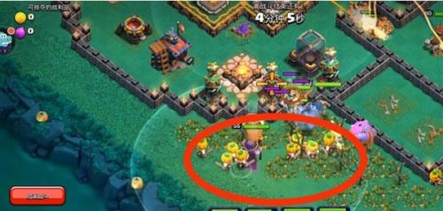 5、女王在拆炸弹塔的时候,就在下面的红色方框内下南瓜头野蛮人,10个左右就够,吸引x弩仇恨。这样可以进一步保证女王和女武神的状态良好。