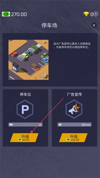 2、在停车场信息界面,点击停车位升级可以进行停车位扩张,或是升级广告宣传提高人流量。