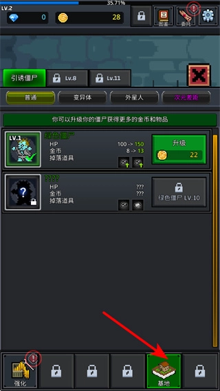 2、点基地按钮,可进入基地界面管理僵尸升级等操作,基地是资源管理和战力规划的核心区域,利用可优化游戏发展。