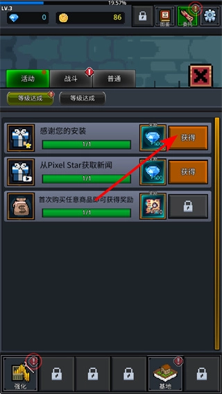 4、点击获得按钮领取钻石奖励,钻石是稀缺资源,可用于解锁特殊功能或加速发展,及时领取可助力游戏进程。