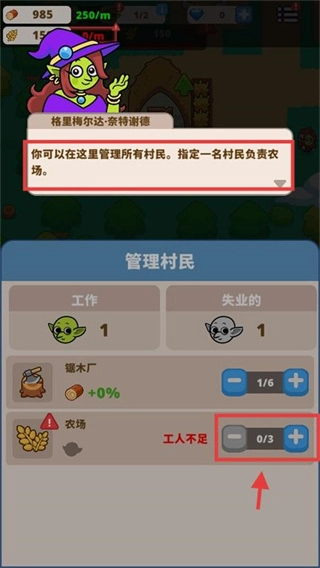1、在村民管理界面,当农场工人数量不足时,可从失业村民中进行分配,点击农场旁的【+】号添加工人,以此保障食材的生产供应。