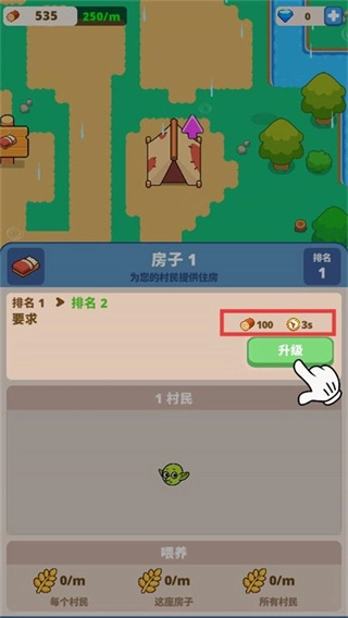3、升级【房子1】需【100】资源和【3】秒时间,满足条件后点击【升级】,提升住房容量引村民。