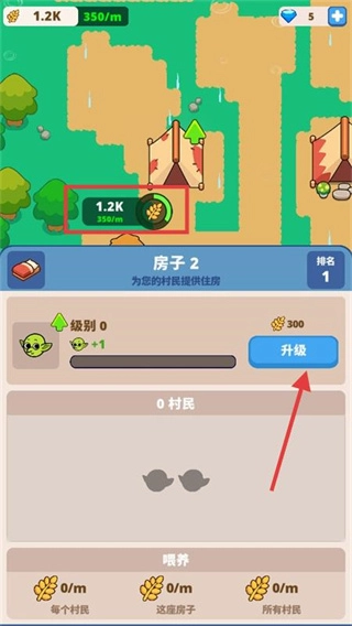 4、升级【房子2】需【300】资源,点击【升级】提等级,关注资源产出【1.2K】-【350】/m保建设。